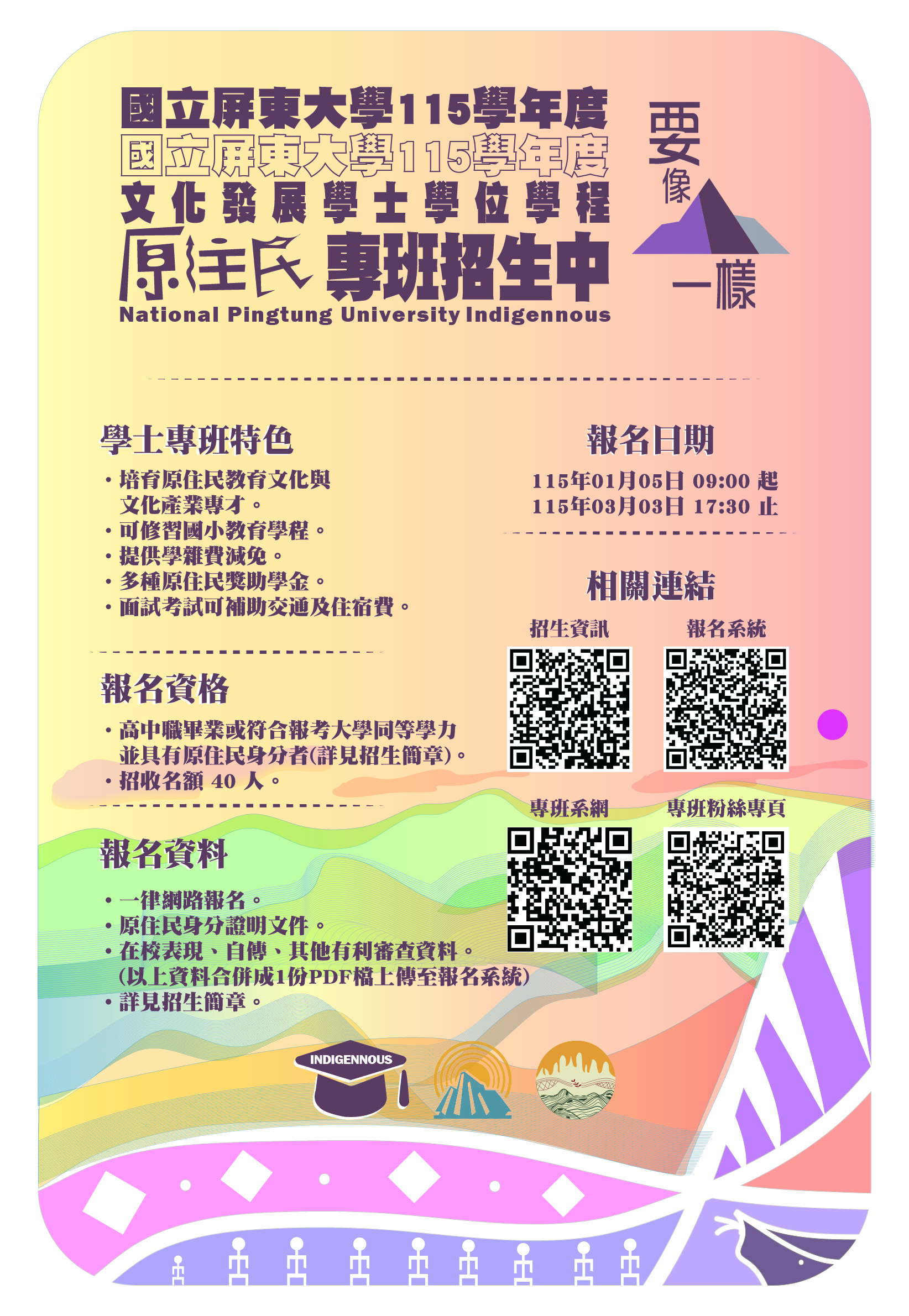 說明: 一、旨揭招生簡章公告於本校招生資訊網頁,不另發售紙本簡章,考生可自行由網頁查詢或列印,招生簡章公告網址:https://reurl.cc/k88Xbq。 二、網路報名日期自115年1月5日上午9時至115年3月3日下午5時30分止,報名網址如下:https://reurl.cc/Qe3Q2O。 三、面試日期:115年3月20日至3月22日。 四、報考資格、招生名額、面試項目及其他相關考試事項等詳如招生簡章。 115國立屏東大學-原住民招生簡章.pdf