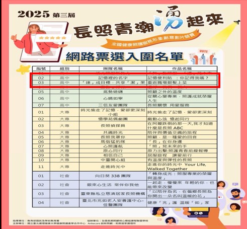 賀!照服三忠 洪証萱 照服一忠劉彩燕、劉家彣(作品:記憶便利貼 ) 及照服三忠 劉冠達 照服一忠 何品潔(作品:重返職場銀髮上菜)參加2025長照青潮湧起來比賽入圍決賽,指導老師:王鈺婷主任。
