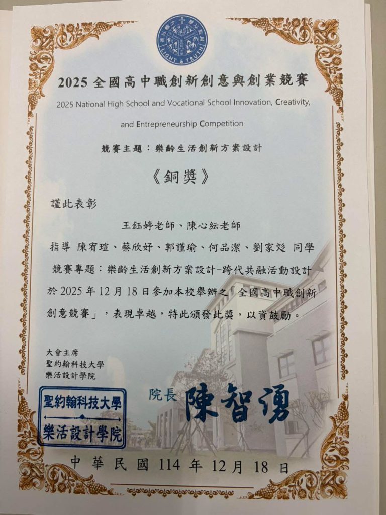 賀!本校照顧服務科學生參加「全國高中職創新創意與創業競賽」,在眾多優秀隊伍中表現亮眼,榮獲銅獎殊榮!感謝王鈺婷老師、陳心紜老師的用心指導