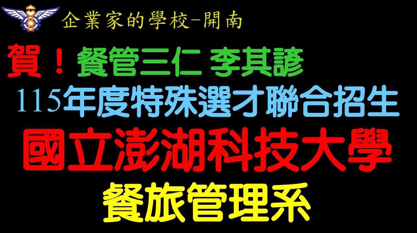 恭喜開南中學餐飲管理科三年仁班李其諺同學榮獲「特殊選才」錄取國立澎湖科技大學 餐旅管理系 正取!